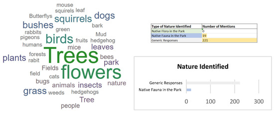 Overall, the results of the content analysis reveal that the majority (n = 209) of the 240 different references to nature identified nature in vague or generic terms (see Figure 13). Words such as ‘trees’ (n = 51), ‘flowers’ (n = 39), ‘birds’ (n = 26), ‘grass’ (n = 17), ‘bugs/insects’ (n = 15), ‘plants’ (n = 11), and ‘animals’ (n = 7) were used. Amongst the more descriptive responses, only 19 references were made to native fauna in the park, with the following all receiving less than 6 responses: ‘bees’, ‘butterflies/butterfly’, ‘pigeons’, ‘rats/mice/mouse’, and ‘squirrels/squirrel’. None of the responses specifically identified any native flora in the park.