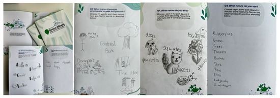 The logbook was designed as a means to facilitate intentional engagement with nature amongst participants, using self-directed simple activities, and was adapted from the Cultural Probe method [37]. Each participant was provided with a Nature Data Probe logbook where a combination of open-ended prompts and tasks around reflecting and observing nature, along with tasks and close-ended questions around nature discovery using data, encouraged the participants to independently engage with nature and record their experiences while in the natural environment. In this recording and reflective journaling process, responses were recorded in the form of text, anecdotes, sketches, and nature data observations (Figure 8).