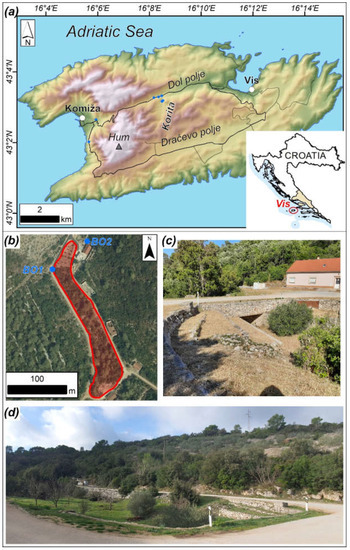 The complex relief on the island of Vis is the result of interrelated geological, tectonic, paleo-geomorphological, paleo-climatological, and anthropogenic processes. The relief consists of three hilly chains, with two valleys of an E–W orientation between them. The highest peak is Hum (587 m a.s.l.). The Korita well field is located in the Korita valley, a dextral valley along the Dol polje (Figure 1a).