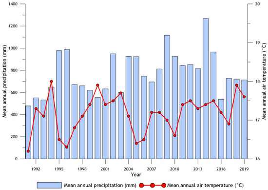 Time series of the mean annual air temperature and precipitation measured at the meteorological station Komiža from 1991 to 2019.