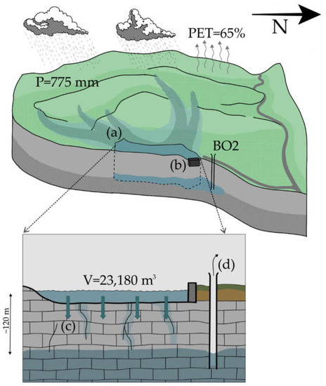 Based on the available climatological and hydrological studies, the infiltration pond would be filled with variable dynamics during different periods of the year. The highest rainfall on the island is expected in the winter, early spring, and late autumn months, and most of the source water for MAR would be secured during these periods. Given the depth of the groundwater table (approximately 120 m) and the favorable hydrogeological properties of the karst aquifer in the Korita well field (i.e., its sufficient storage capacity and matrix-dominated flow; [18,21]), the conceptual model envisions that the water recharged during the wet period would have a positive long-term effect on the local groundwater level and assist with peaks in demand during summer.