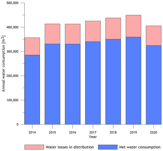 Figure 5 shows the annual water consumption in the period from 2014 to 2020. Losses in the water distribution system amounted to approximately 25%.