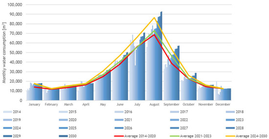 A distinct increase in water consumption during the summer months is evident in Figure 6. In August, the water consumption was the highest, and this represents approximately a six-fold increase compared to the winter months, which commonly had the lowest water consumption. The year 2020 was a non-specific year in terms of water consumption; however, in August, the water consumption was very high compared to the remaining summer season due to the arrival of many domestic guests. The water consumption data in 2020 shows the significance of tourism in terms of water consumption on the island. By applying the assumption from Table 1, the future demand was projected until 2030 (Figure 6).