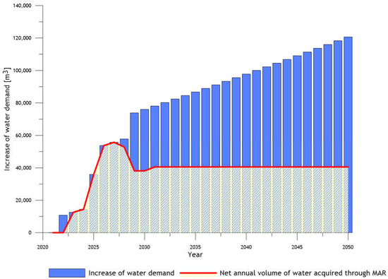 At the beginning of the projection (i.e., in 2021), the entire additional water demand could be covered by the MAR. Additionally, the recharged quantity surpassed the increase in water demand in the first years of the project, hence, the cumulative annual (“unspent” water) would remain in the aquifer for subsequent recovery in the upcoming years. Afterward, approximately half to one-third of the demand could be covered in the mid-term and long-term, respectively (Figure 7).
