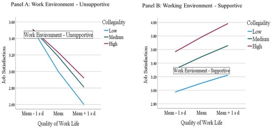 Work environment moderates the moderated relationship between QWL and collegiality to influence job satisfaction, such that, in a supportive (unsupportive) environment, higher (lower) levels of collegiality interact with QWL to positively (negatively) influence job satisfaction.