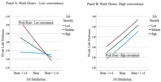 Work hours moderates the moderated relationship between job satisfaction and job security to influence WLB, such that, at high (low) level of convenience of work hours, higher (lower) job security interacts with job satisfaction to result in an increase (decrease) in WLB.