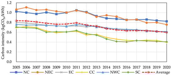 Considering power exchanges among the regional grids, the carbon intensity of electricity supply in each power grid was evaluated according to Equation (8). The difference in carbon intensities between electricity generation and supply was analyzed, and the results are shown in Figure 4. For the NEC, NWC, and SC grids, the electricity supplied by other grids was not considerable, and, therefore, the carbon intensities of electricity generation and supply were similar. For the CC grid, the carbon intensity of electricity supply was higher than that of electricity generation, and the difference between them increased in recent years. The reason was that the CC grid used more electricity supplied by the NWC gird, of which the aggregate carbon intensity of electricity generation was relatively high. For similar reasons, the carbon intensities of electricity supply were lower than those of electricity generation in the NC and EC grids.