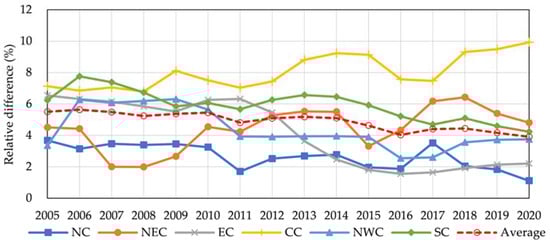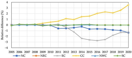 Based on the analysis of electricity supply and transmission loss, the associate carbon intensity of final electricity consumption was evaluated according to Equation (11), and the results are summarized in Table 6. The associate carbon intensity of final electricity consumption in SC grid was the lowest at 0.425 kgCO2e/kWh in 2020, and the highest value at 0.879 kgCO2e/kWh occurred in the NC grid. Descending trends were observed in the associate carbon intensities, especially after 2011. Moreover, the difference between the carbon intensities of electricity generation and use are compared in Figure 5. There was a fluctuation in the difference between the two emission factors, yet an overall descending trend was observed in the difference, which indicated that the transmission loss was better controlled in recent years.