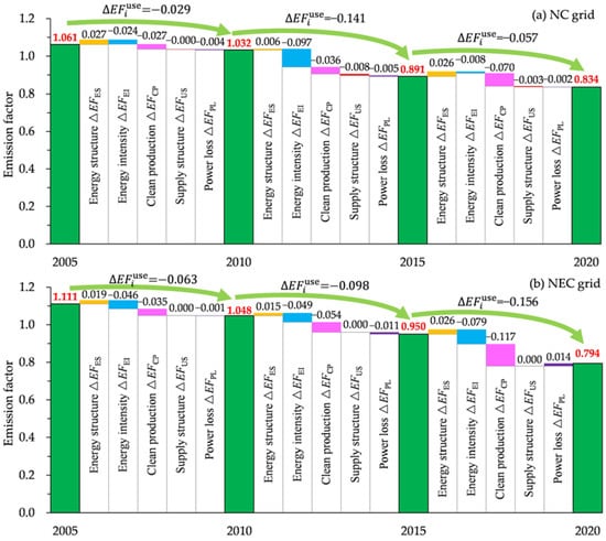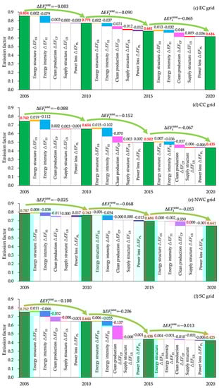 Detailed results of LMDI decomposition for each regional power gird are demonstrated in Figure 6. As indicated in Figure 6, the assessment period was divided into three stages: (a) Stage 1 including a 5-year period from 2005 to 2010; (b) Stage 2, including a 5-year period from 2010 to 2015; and (c) Stage 3, including a 5-year period from 2015 to 2020. The characteristics of the five driving factors varied considering different regional grids and stages.