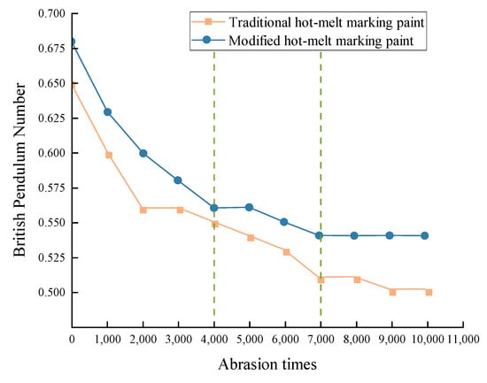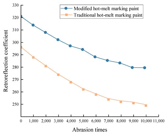 Figure 4 depicted the variety of retroreflection coefficients of the modified and the traditional hot-melt marking paint. By comparing the retroreflective brightness coefficients of the two coatings, the retroreflective performance of the coating with 4% hydrophobic material is more excellent. And the initial value of the retroreflective coefficient is 8.45% higher than that of the traditional hot-melt road marking. The retroreflection coefficient of the modified marking line decreased by approximately 12.5% when the test was over, while the retroreflection coefficient of the traditional marking line decreased by 15.82%. The decrease in retroreflective performance of the marking line can be attributed to the increasing number of abrasion cycles, causing a loss of glass beads. This observation signs the enhanced wear resistance of the modified marking line in comparison to the traditional marking line. Based on the test data presented in Figure 4, it can be seen that under identical conditions the modified hot-melt marking paint exhibits superior durability compared to the traditional hot-melt marking paint. This attribute contributes to a reduction of the expenses associated with road marking paints replacement, thus promoting the sustainable application of road marking paints. Additionally, the retroreflection performance of the marking lines is enhanced, enabling enhanced visibility for drivers and thereby improving overall driving safety.