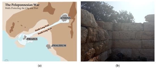 The walls were built in several phases, starting in the middle of the 5th century before Christ (BC), and were about 6 km long [47]. The walls were destroyed by the Spartans in 403 BC after the defeat of Athens in the Peloponnesian War, and then rebuilt with Persian help during the Corinthian War in 395–391 BC. The Long Walls were an important element of Athenian military strategy as they provided a constant link between the city and the sea and also blocked sieges conducted by land (see Figure 4).