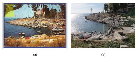 (a) View of the harbor with fishing boats in 1970; (b) same view in 2020; in the background, the monument of the Unknown Sailor.
