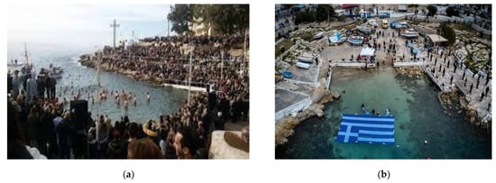 A fourth element of intangible cultural heritage is a Christian ceremony that takes place at this site, according to Greek tradition. Every year, during the celebration of the Epiphany (6 January), a priest, surrounded by brave young men and boys, throws a cross into the sea and the young men jump into the icy water to catch it. Whoever catches the cross is considered blessed for the whole year. In addition, this year, Greece celebrated the 200th anniversary of its independence, which resulted in a ceremony in which a Greek flag was flown on the waters of the Gulf specific (see Figure 7).