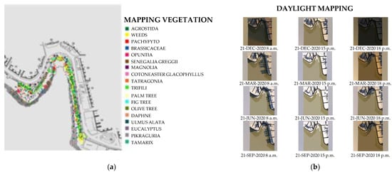 The analysis of the area was undertaken by the student groups over the course of a day and consisted of three main thematic areas: urban and environmental analysis, cultural and natural heritage analysis and sensory mapping analysis. The urban analysis focused on Kevin Lynch’s methodology [52], land use analysis, pedestrian and vehicle movement analysis and environmental parameter analysis, including solar analysis, prevailing wind analysis and lighting analysis. Aspects of natural heritage, such as vegetation, were mapped in this phase of the analysis and are presented below for illustrative purposes, while other aspects, primarily cultural, were addressed in the literature review. The third area of the thematic analysis, the sensory approach, is presented in more detail, with a map for each sense. Figure 8, Figure 9, Figure 10 and Figure 11 show examples of the maps created. As shown in Figure 8a, the urban analysis showed a variety of potentials in terms of movement, possible new pedestrian routes closer to the waterfront, possible bike lanes, changing the width of streets to create wider pedestrian paths, etc. Lynch’s methodology also revealed a number of interesting landmarks in the study area. This is linked to the cultural heritage assessment carried out through observation, documentary analysis and discussion with the local community (see Figure 8b).