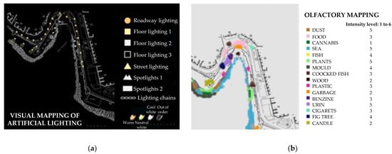 Sensory mapping completes our understanding of the site and its experience through urban and environmental analysis and input from residents. The sensory maps are classified into visual maps, sound maps—soundscape, smell maps—scent landscape and tactile maps. The analysis through mapping of the different parameters related to the human senses has generated a more holistic approach that in turn will create a more comprehensive environmental strategy, including sustainable practices for each parameter that shapes the space and is related to the user’s comfort strategy. Visual maps are related to the parameters of visual comfort, namely preference for visual views and stimuli, appropriate lighting levels and elimination, where possible, of glare. Appropriate lighting levels should be defined [37,38], energy consumption should be minimized, light pollution should be avoided [39,40] and historic buildings should be lit accordingly to serve as landmarks [41,42,43]. Sound maps are digital maps that focus on the sound representation of a specific location. The term “soundscape” [29] refers to the sound environment of a specific location. It can also refer to real environments or abstract constructs, such as musical compositions and tape montages, especially when considered as an artificial environment. Sound research is also related to sound identity in the city and biocultural sound diversity [44]. Odor maps are developed based on the specific odors of cities that determine the relationship of people to their place of residence. The smell of a city can be a combination of street markets, restaurants and the types of food they offer, erosion of building materials, emissions from roads and transportation, waste odors and the smells of residents [45]. Texture maps are maps that identify the different materials and finishes that can be found in an urban environment. They can be related to thermal and visual comfort as well as embodied energy demand. These maps are directly related to the materials used in urban design [46].