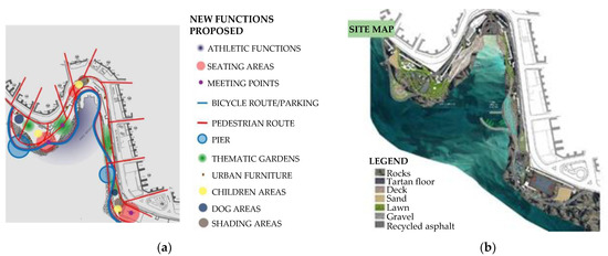 Field research, also called on-site research, in the case study area was used to identify the various indicators needed in the pre-design phase of the coastal zone analysis and to eventually create a tool to facilitate this application. Various traditional analysis techniques were used, such as urban and environmental analysis (land use, solar and wind analysis, etc.) and Kevin Lynch’s methodology [52]. The results were not particularly informative despite the diverse preferences of users as to what new facilities they would like to have on the site. Nevertheless, they were undertaken and incorporated into the final outcome. In addition, participatory design was attempted through questionnaires to anonymous users of the site. The results were not particularly informative despite the diverse preferences of users as to what new facilities they would like to have on the site. For this reason, user perceptions are only briefly presented in Table 1.