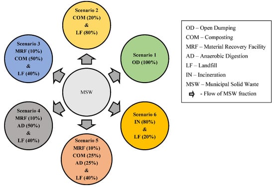 There are six scenarios, including the baseline scenario for the MSW management system practices in Banepa (Figure 3).