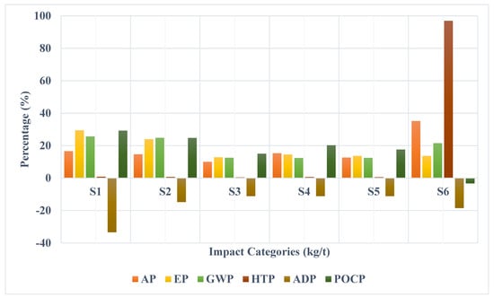The findings in Figure 4 are based on the six impact categories (GWP, AP, EP, HTP, ADP, and POCP), respectively. Scenarios 3, 4, and 5 are also shown to have the highest abiotic depletion potential (−0.03 kg Sb eq./t), resulting in the over-extraction of non-fossil fuels (renewable resources) compared to the other scenarios. Scenario 1 had the least ADP (−0.09 kg Sb eq./t). For landfilling, a unit kg of MSW had 0.13 ng of ADP [30]. Human toxicity is caused by the emission of pollutants, such as particulate matter, SOx, NOx, and heavy metals. Scenario 6 (incineration combined with landfilling) resulted in the highest HTP (944.56 kg 1,4 DB eq./t) due to the high emissions of heavy metals, SOx, and NOx during the combustion process. Out of the possible outcomes, Scenario 3 had the lowest environmental impact (4.55 kg 1,4 DB eq./t), which suggests that composting and material recovery have less of an influence on toxicity-causing agent emissions than landfilling. The chemical interactions between NOx, carbon monoxide, and VOCs in the presence of sunlight produce tropospheric ozone and asthma, and other respiratory issues may also arise from low levels of ozone exposure [6]. Scenario 1 possessed the maximum POCP (0.12 kg C2H4 eq./t), where diesel usage, methane production, and NOx emissions were the major contributors. In addition, a large amount of photochemical oxidant precursors (VOCs, CO2, NO2, NOx, and fine particles) can be released during the process. Scenario 6 had the least POCP (−0.01 kg C2H4 eq./t).