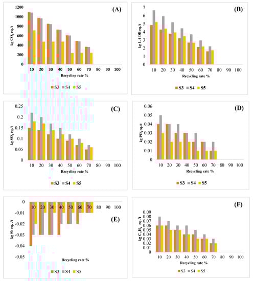 The result of the sensitivity analysis based on increasing the recycling rate from 10% to 70% is included in Figure 5. The analysis showed that MSW for landfilling and biological treatment, including composting and AD, vary from 15 to 45% as recycling ranged from 10 to 70%. This also indicates that the environmental effects of the sensitivity analysis results are caused by the variation in the recycling rate (variation in the quantity of recyclables such as paper, plastics, metals, textiles, etc. quantified in terms of percentage) in scenarios, i.e., Scenario 3, 4, and 5. The change in recycling rate and the effects on the environment are inversely correlated as in the previous studies [7,9]. As a result, it was determined that the introduction of MRF would increase the environmental advantages of recycling. Research has also shown that combining MRF, composting, and landfilling results in increased environmental benefits.