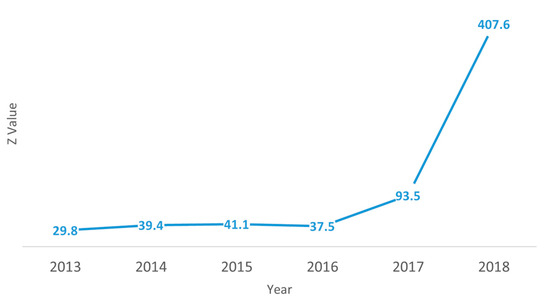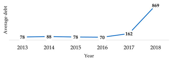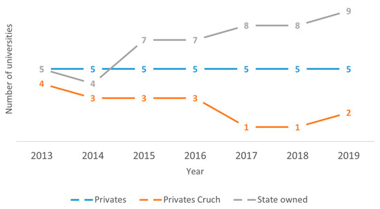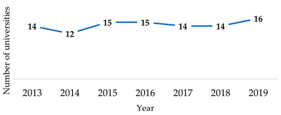 Financial vulnerability is a condition that negatively affects the management of an organisation [80]. In accordance with this reality, (5) and (6) were estimated for universities affiliated with gratuity. Figure 1 shows that between 2013 and 2019, the number of vulnerable universities increased from 14 institutions in 2013 to 16 in 2019. This analysis was conducted from 2013 to 2015, and the gratuity was found to increase in one institution during each period.