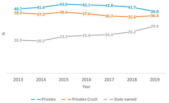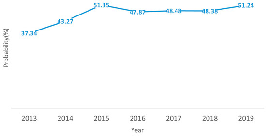 When considering universities by property and membership in the CRUCH, with the evolution of the probability of financial vulnerability of universities affiliated with gratuity, we found that private universities that do not belong to the CRUCH do not change their probability, which remained at 84%, on average, for the study duration. Private universities belonging to the CRUCH showed a reduction in their vulnerability probability (in 2013, this value was 47.28% and in 2019, it was 23.22%). State-owned universities increased their probability of vulnerability over the entire period analysed (beginning in 2013 (31.75%) and ending in 2019 (55.77%); see Figure 4).