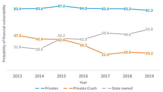 The results shown in Figure 1 and Figure 2 are consistent with those proposed in [62,63,64], which identified and reinforced the factors that affect financial vulnerability in education institutions. According to the above analysis, the probability of financial vulnerability has increased, on average, for all universities affiliated with gratuity (see Figure 2). Thus, H1 is accepted.