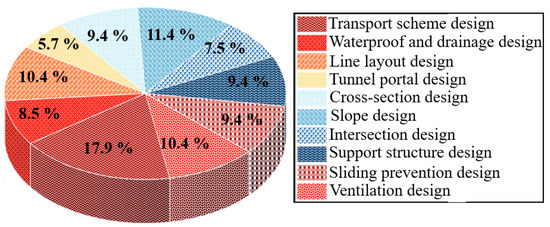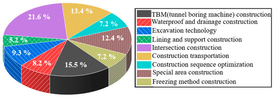Statistics show that the transportation scheme and longitudinal slope design account for the largest proportions of related studies on inclined shaft design at 17.9% and 11.4%, respectively. In studies on inclined shaft construction, the construction method of the intersection between the inclined shaft and the main tunnel and the construction technology of the TBM inclined shaft were mostly studied; these accounted for 21.6% and 15.5%, respectively. Comparatively, there is no obvious difference between the portal of the inclined shaft and the design and construction of the support scheme compared to those of a general tunnel; therefore, the research publications are also fewer and account for <10% of the total. Additionally, different research directions correspond to different time distribution rules. For example, the slag transportation research scheme on inclined shafts mainly focused on the period of 2011–2013, and the TBM construction technology research on inclined shafts was mainly conducted after 2016. Statistics on the application field of inclined shafts show that most of the early cases of inclined shaft analysis were based on coal mine roadways; however, with the construction needs of long mountain tunnels, research on related cases of inclined shafts in mountain tunnels has gradually increased.