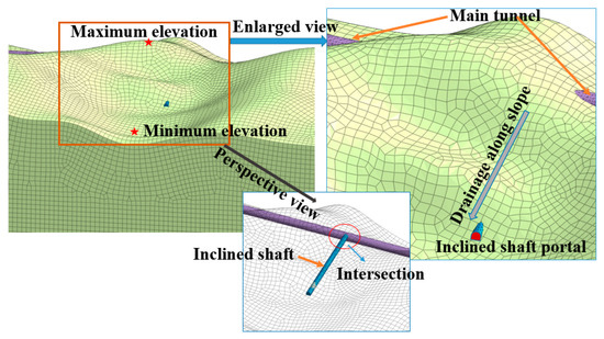 When the topography of the tunnel site is significantly undulating and each condition is suitable, an inclined shaft can be set along the slope according to the topography to give full play to the advantages of drainage along the slope; this saves energy and effectively deals with water inrush accidents. One project we participated in before had a similar situation and a three-dimensional numerical model combined with terrain was established as shown in Figure 4. Considering the pressure of the surrounding rock, some scholars have shown that when the longitudinal slope of the inclined shaft increases, the bearing capacity of the surrounding rock increases [13,14], and properly increasing the longitudinal slope of the inclined shaft can improve the stability of the surrounding rock. In highway tunnels, ensuring operational ventilation is one of the main functions of an inclined shaft, and the steep-slope inclined shaft is mostly used in design to control construction and operational ventilation costs. Constrained by domestic intelligent and mechanised construction levels, large longitudinal inclined shafts are associated with many difficult problems, such as slow construction progress, high risk, and great difficulty [15]. Therefore, the mechanical construction of an inclined shaft is an important future research direction. In contrast, the mechanised construction of inclined shafts abroad began earlier. For example, in the 1990s, Japan extensively used an ME632H inclined shaft-side unloading loader, which can achieve the construction of 30° inclined shafts. Additionally, a Clyde Gate rock grabber in North America also succeeded to excavate a 55° large longitudinally inclined shaft [16]. To compensate for the backward situation of large-scale construction equipment, China should also, in the future, begin to study the mechanical matching of large, longitudinal, slope-inclined shaft construction with the use of large-scale rock-loading equipment.