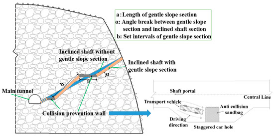 For a large-length inclined shaft, considering disaster prevention requirements, it is appropriate to set gentle, flat, or even reverse slopes along the longitudinal section of an inclined shaft. For example, it is stipulated in the specification that a ramp section with a longitudinal slope of not less than 3% should be set at the portal of the inclined shaft to avoid water flowing from the outer parts into the inclined shaft, and a transitional gentle slope section should be set at the bottom of the shaft. In addition, a vertical curve transition with a radius in the range of 12–20 m should be used at the change point of the wellhead and bottom of the shaft. A gentle slope section with a longitudinal slope <3% should also be set every ~200–300 m to provide space for the installation and construction of inclined shaft drainage protection facilities, staggered lanes, and crashproof car-sliding equipment. However, in actual engineering, the design of the gentle slope section of an inclined shaft should not be generalised, and the slope and length of the gentle slope section should be adjusted in time. A slope that is too gentle increases the overall slope and length of the inclined shaft. A slope that is too large or a gentle slope section that is too short will reduce the cushioning effect, as shown in Figure 5.