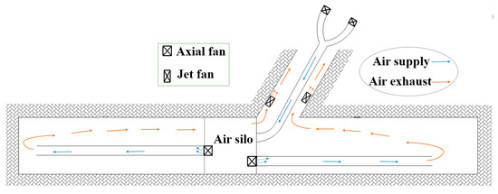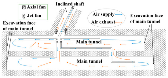 In some cases where the ventilation requirements of the twin-line main tunnel are met simultaneously, the cross-channel between the twin-line tunnels can be excavated to coordinate with the inclined shaft for ventilation, as shown in Figure 8 [26]. It was found that when the inclined shaft adopted forced ventilation, the main factors which influenced the ventilation efficiency were the angle between the inclined shaft and main tunnel, length of the tunnel, and the distance between the air duct opening and tunnel face. In addition, the longitudinal slope of the inclined shaft influences forced ventilation [27].