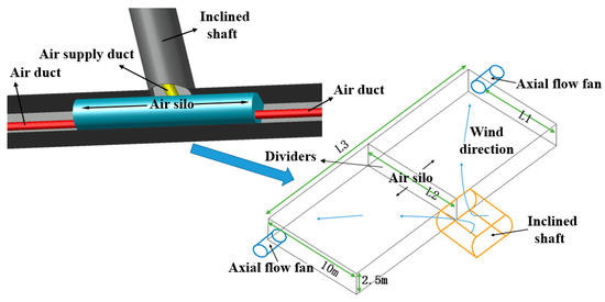 In recent years, to solve the problems of low efficiency of forced ventilation and small airflow in the working face, a silo ventilation scheme has been developed and applied. This ventilation scheme involves setting up an air silo at the intersection of the inclined shaft and main tunnel and the installation of axial fans in the air silo, which can effectively control the airflow from the air outlet to the excavation face and improve ventilation efficiency [32,33]. The silo-type ventilation of the inclined shaft auxiliary main tunnel mainly includes two types: duct-combined and bulkhead-combined air silos. In the duct-type ventilation scheme, fresh air is pressed into the silo at the bottom of the inclined shaft by axial flow fans, and the air is then supplied to the main tunnel in two directions by axial flow fans on both sides of the silo. After removing the harmful gas, it is discharged out of the tunnel by jet fans through the inclined shaft, as shown in Figure 10. Bulkhead-combined air silo-type ventilation has fewer applications than duct-type ventilation, but the large space section on the upper part of the bulkhead can significantly reduce the resistance along the way and improve ventilation efficiency. When the air demand for heading-face construction is large, several groups of relay jet fans can be set in the partition panel intake duct to ensure a fresh air supply in the air silo, while jet fans can also be installed in the exhaust duct to provide auxiliary power for the exhaust of dirty air. This set of ventilation systems can be used for the construction of long complex tunnels on multiple working surfaces, as shown in Figure 11. According to the study by Chen et al [34], the specifications of the air-storage silo and the arrangement position of the fan significantly influence the ventilation efficiency of the axial flow fan. When the fan is farther from the inclined shaft port (L1), the silo length (L3) is larger, the partition length (L2) has the same width as the silo, and the efficiency is higher. The efficiency was stable when the silo length was larger than 25 m (see Figure 12 for the optimal arrangement scheme).