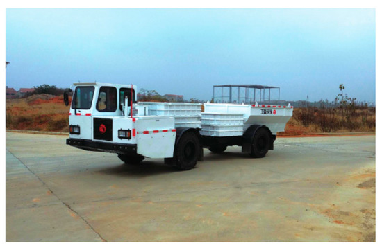At present, the developed large-power electric transport vehicle has good transport performance. For example, the battery-powered tractor designed by CRRC Sifang Co., Ltd. (Qingdao, China) is driven by a rear axle rubber wheel, which includes two operation modes: tracked and trackless. The maximum operating speed is 22 km/h, and the maximum climbing angle can reach 20° during trackless transport, as shown in Figure 14 [40]. Following the development of electric vehicle technology, electric vehicles can undertake inclined shaft excavation, slag removal, and transportation, which has broad application prospects in the future.