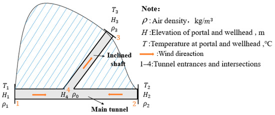 where and are the thermal potential differences from the tunnel portal 1 and 2 to the inclined wellhead (Pa), is the average density of portal 1 and inclined wellhead 3, , is the average density of portal 2 and inclined wellhead 3, , represents the relative height difference between I and j (m), and is the air density in the tunnel (kg/m3).