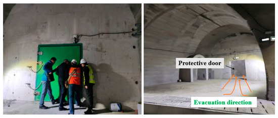 Formula (7) shows that the greater the temperature difference inside and outside the tunnel and inclined shaft, the greater the air density difference, and the greater the corresponding thermal potential difference. Overall, the wind speed in the inclined shaft tunnel is positively correlated with the environment and the temperature difference between the main tunnels. Typically, the temperature in the main tunnel changes slightly. When the ambient temperature in the winter is less than the temperature in the tunnel, the inclined shaft wind direction is exhausted. When the ambient temperature in the summer is greater than the temperature in the tunnel, an inclined shaft wind direction is supplied. If the inclined shaft only plays the role of auxiliary main tunnel ventilation during operation, the number of fans can be controlled according to the wind direction of the inclined shaft during different seasons to achieve maximum energy conservation. In cases with inclined shafts for long and large railway tunnels, if it is used as an emergency rescue passage, the protective door at the intersection of the inclined shaft and the main tunnel should be opened for evacuation in the case of an accident (as shown in Figure 16). However, owing to the influences of seasonal temperature, wind speed, or wind direction at the protective door, the specification requirements may not be met.