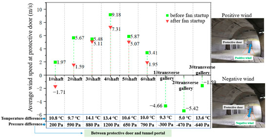 In 2021, one of the authors quantified the wind speed, wind pressures inside and outside the tunnel, and temperature at the protective door of the auxiliary tunnel in nine tunnels on a railway line, as shown in Figure 17. The results show that when the protective door was turned on and the jet fan was not turned on, some protective doors had wind blowing to the main tunnel (the wind direction did not meet the requirements), whereas the wind at the protective door between the cross-tunnel passage and the main tunnel blew from the main to the cross-tunnel (the wind direction met the requirements). When the jet fan installed in the auxiliary tunnel was turned on, only part of the inclined shaft protective door was associated with air flows in the opposite wind direction; in this case, the wind speed met the requirements. However, the wind direction or wind speed of the other inclined shaft protective door could not meet the specification requirements. The aforementioned results are only the measured results at a certain time during winter. If the test was conducted in the summer, opposite results may be obtained. Therefore, it is recommended to strengthen the monitoring of wind speed and the thermal potential difference at the tunnel’s protective door subject to the conditions listed above; this can accumulate data, achieve linkage control, and accomplish the timely adjustment of the working state of the fan to achieve a balance between operational ventilation and tunnel energy conservation [46].