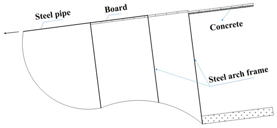 In addition to the pressure of the surrounding rock, many factors influence the selection of support parameters for inclined shafts. Ji and Lv [52] indicated that for a water-rich sand layer, its structure is loose, its cohesion is small, and the surrounding rock of the inclined shaft in this formation is easily relaxed and deformed. As shown in Figure 18, reinforcement support measures, such as formation reinforcement and well-point precipitation, grouting in the tunnel, and the freezing method [53], are needed to enhance the stability of the surrounding rock of the inclined shaft in the water-bearing sand layer. The study also shows that when precipitating the surrounding rocks of deep-buried water-rich inclined shafts, the axial force and bending moment of the tunnel side wall significantly increase, while the axial force at the tunnel arch and inverted arch decreases; with the discharge of water, the compressive stress concentration will occur in the inclined shaft lining at the stratum junction. Therefore, the support measures need to be strengthened in the position where the internal force of the inclined shaft increases and stress concentration will likely occur. The joint-support scheme of a wooden board and small pipe shed (Figure 19) was designed for an inclined shaft in a water-rich sand layer, which can effectively alleviate extrusion and sand outcropping at the excavation face. Niu [54] found that for inclined wells in water-bearing strata, when conventional support measures are used to support them, the deformation increases significantly, and the difficulty of support is significantly higher than that in non-water-bearing strata. For a large inclined shaft section in non-water-bearing strata, temporary support with a steel arch and permanent support with a steel mix can play a very good role in surrounding rock reinforcement. Therefore, the necessary advance pre-support should be applied to water-bearing strata.