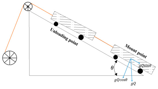 In Formula (2), is the maximum climbing angle of the tramcar (rad), is the maximum loading mass of the tramcar (T), is the dead weight of the tramcar (T), and is the maximum static tension of steel wire rope for tramcar lifting (T).