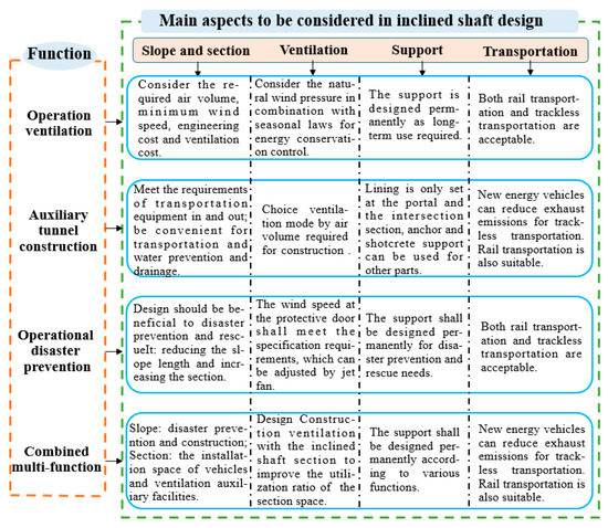 In recent years, inclined shafts have been widely used in long mountain tunnels, but the corresponding design and construction technical specifications need to be improved. By means of literature statistics and actual cases, a comprehensive and systematic review is made on the tunnel profile, lining structure, construction and operation ventilation, construction methods, and machinery of inclined shafts for long mountain tunnels. The results show that: (1) The design of a gentle slope section of an inclined shaft with large longitudinal slope needs to be further improved; (2) When an inclined shaft is only used for ventilation in the operation stage, it is necessary to make full use of the natural wind and eliminate its adverse effects; (3) It is suggested to study the supporting parameters of an inclined shaft in order to realize the standardised design of the supporting parameters; (4) The space of an inclined shaft is narrow, and it has practical demand in improving the automation, intelligence, management, and dispatching level of transport vehicles. In the future, it is an inevitable trend for electric vehicles to replace fuel vehicles. It is necessary to carry out further research on inclined shaft longitudinal slope design, construction and operation ventilation design, and transportation mode.