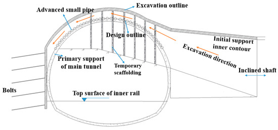 - There is no essential difference between the excavation method for an inclined shaft section and a main tunnel. It can be divided into the forward-well and reverse-well methods from the construction direction. The inclined shaft can be used as the auxiliary construction passage when the forward-well method is used, while the inclined shaft can only play the role of operation ventilation when the reverse-well method is used. The cross-section of the inclined shaft and main tunnel is the key and difficult point in construction. Direct top-lifting, transitional top-lifting (small guide tunnel method), and large package methods can be used in the construction of the inclined shaft to turn into the main tunnel. At this stage, the research studies on the cross-section of the inclined shaft and main tunnel mainly focus on construction technology. Accordingly, additional studies on different applicable conditions of construction methods and spatial stress characteristics of support ought to be conducted.