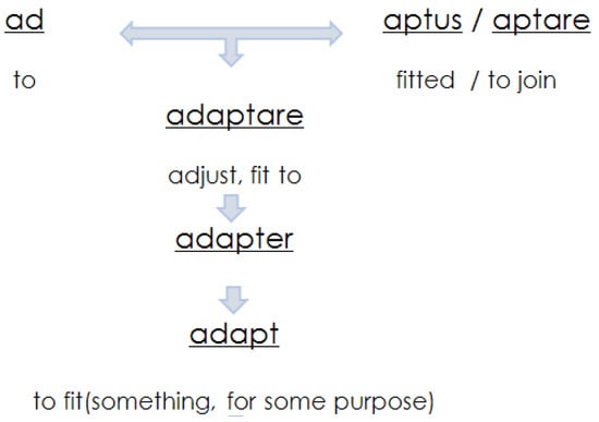The fact is the historic physical elements, which continue to stratify, are under the threat of degradation and extinction in the process, which is directly linked to loss of local culture and collective memory. To prevent this situation, changes have been made in conservation policies, and many strategies and policies have been developed on global and local scales. One of these policies—AR—is preferred. The word adaptive is based on the French and Latin languages by origin (Figure 1). Old French has the word “adapt”, which means to fit (something, for some purpose), and Latin has the word “adaptare”, which means to adjust/fit to [2].