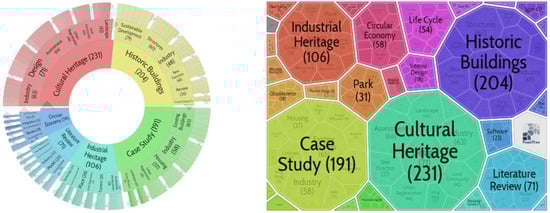 A preliminary review of the phrase “adaptive reuse” or “adaptive re-use” was made under the “Title/Abstract/Keywords” heading via the selected database, the WoS. No restrictions were imposed during the interrogation to determine with which disciplines and keywords the subject was studied together in the international literature. As a result of the scan, 863 documents were reached. The documents were printed out in Excel and clustering analysis was performed with Carrot Search. The results are shown in the visual information map (Figure 3). The size and angles of the bubbles in the figure represent the relationship with the subject and number of documents.
