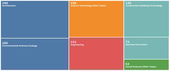 In research areas (Figure 4), the discipline of architecture (199 documents—23.09%) is in the foreground. The other research areas in the top five are Environmental Sciences Ecology (185 documents—21.46%), Science Technology Other Topics (156 documents—18.10%), Engineering (153 documents—17.759%) and Construction Building Technology (135 documents—15.66%). The fact there are several studies in engineering, economics and ecological fields apart from the discipline of architecture, indicate the subject has been widely covered and gained an important place numerically.