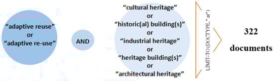 The search query was scanned in the “Title/Abstract/Keywords” headers of the WoS core collection. The interrogation was conducted on 15 November 2022. The scanned words were carried out in parallel with the preliminary analysis result (Carrot Search). A query strategy based on keywords was determined: (“adaptive reuse” or “adaptive re-use”) and (“cultural heritage” or “historic building” or “historic buildings” or “historical building” or “historical buildings” or “industrial heritage” or “heritage building” or “heritage buildings” or “architectural heritage”). The 863 documents scanned and obtained in the preliminary analysis were re-examined in the Title/Abstract/Keywords headings with the identified keywords. As a result of the search, 414 documents were flagged. After that, scanning was completed with 322 documents by limiting them under the ‘article’ heading from the ‘document type’ option (Figure 5 and Figure 6).