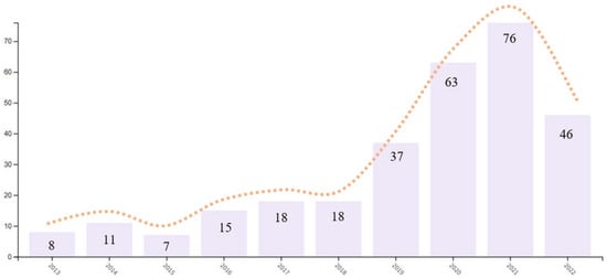 The number of publications dealing with the keywords determined by the adaptive reuse concept according to year is shown in Figure 7. According to the research analysis results, publications between 1992 and 2022 were considered. Although the first article was published in 1992, it was found there was no research on the scanned feature until 2007. While it was observed the research continued decisively and demand was low until 2007 to 2011, interest increased between 2012 and 2018. It reached the highest quantitative level in research in 2021 with a consistently high publication graph. However, while the highest number of publications was reached with 76 documents (23.602%) in 2021, the publication of 46 documents (14.286%) until 15 November 2022 indicated a decrease of 9.316% in all publications, while there was a significant decrease of 39.473% between 2021 and 2022. This decrease in research trend reveals an important situation. Although research suggests adaptive reuse is an expected increase in the circular economy and the building and construction industry [10], this prediction is not realized based on the data put forward depending on the research topic.