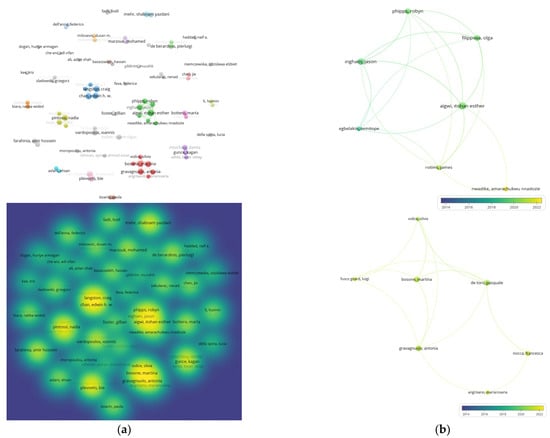 Analysis of the 76 co-authors of 322 documents obtained from the WoS: (a) Author relations and the density cloud in the field of study, (b) Cooperation and periodic analysis of two groups.