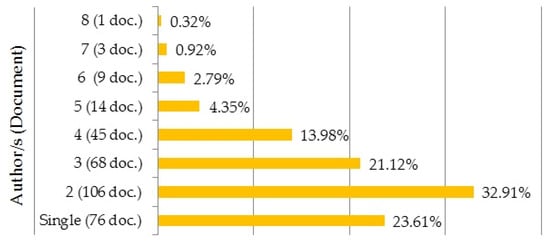 When the research is handled with author collaborations (Figure 9), the degree of cooperation is observed at 76.39%. In this high researcher collaboration, 32.90% have two authors. For this reason, it seems that works are mostly handled by two authors.