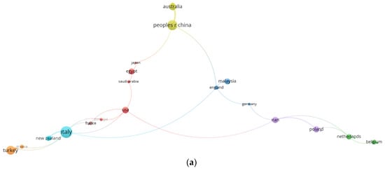 To determine the most effective countries discussing the research topic and cooperation between them, a “country network analysis” was created (Figure 10). The distribution of the studies by countries in number, the relationship of the countries with each other, of periodic publications and the density cloud in the study area are shown. To provide more detailed data before the analysis is performed in VOSviewer, the minimum number of documents and citations for a country is limited to two. While it is seen that the 322 documents reached after the screening were prepared in partnership with 58 countries, this was reduced to 39 countries after the limitation. However, when the connections between the countries were examined, it was seen that 27 countries were interacting more with each other. At this point, the field of research should be expanded to more countries, explored and brought into the literature. The size of the circular clusters formed in the analysis refers to the numerical magnitude of the studies carried out on the research. The curvilinear lines between them analyzes the countries’ cooperation in the field of research.