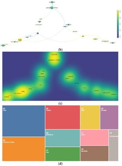 The number of publications and density clouds of 27 countries belonging to the 322 documents obtained from the WoS: (a) The countries’ relationships with each other, (b) Periodic publications by the countries, (c) The density cloud in the area of the countries, (d) The number of publications from the countries.