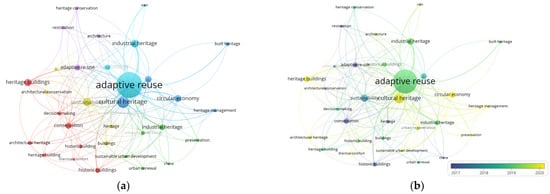 Analysis of the most preferred keywords in the documents dealing with the research topic is shown in Figure 11. Before the analysis was performed in VOSviewer, the minimum number of occurrences of a keyword was limited to five to provide more detailed data. While it was seen there were 1107 keywords in the 322 documents reached after the scan, 32 keywords were preferred more frequently after the restriction. The analysis shows, as of 2017, the potential relationships between keywords and interest in the research topic increased. The most used topics supporting the concept were cultural heritage, sustainability, heritage buildings and industrial heritage, respectively. The size of the node expresses the power and frequency of using a keyword, while the proximity between two nodes indicates the relevance of concepts between each other. The gradient colors in the analysis map, which turn from dark blue to yellow, represent the years. Blue-colored nodes highlight keywords that appeared early, while yellow-colored nodes highlight keywords that appeared recently. Although the yellow nodes focus on the concepts of cultural heritage and heritage buildings, there is a correct approach to the concepts of circular economy, urban regeneration, heritage management and urban development. This analysis is important in terms of revealing the changing trends of the research subject.