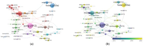 The analysis of references to the documents dealing with the research topic is shown in Figure 12. To reveal more detailed data before the analysis performed in VOSviewer, the minimum number of citations to a document is limited to 10. As a result of the limitation, 74 studies received the most citations. Among these 74 studies, it was found that 55 documents have more relational connections. Research articles by Yung [11], Misirlisoy [12] and Foster [13] have been cited over 100 times and are preferred references.